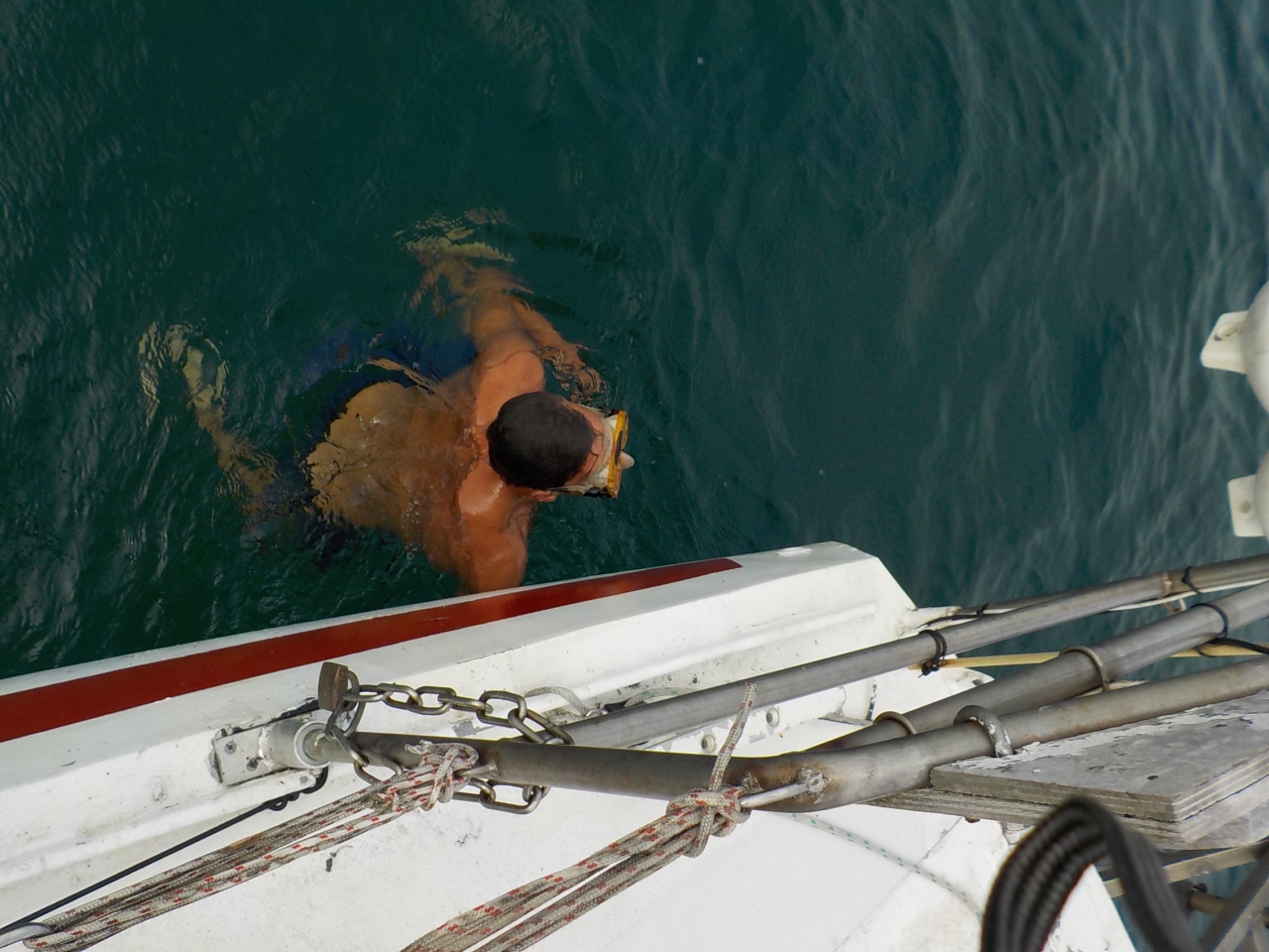 Louis plonge pour voir s’il y a un souci avec l’hélice, niet