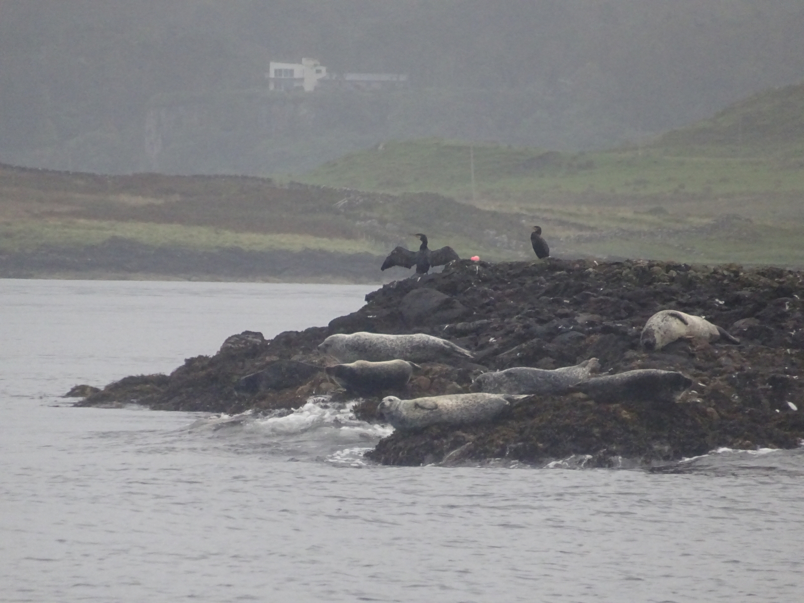 encore des phoques et un cormoran qui sèche dans la bruine